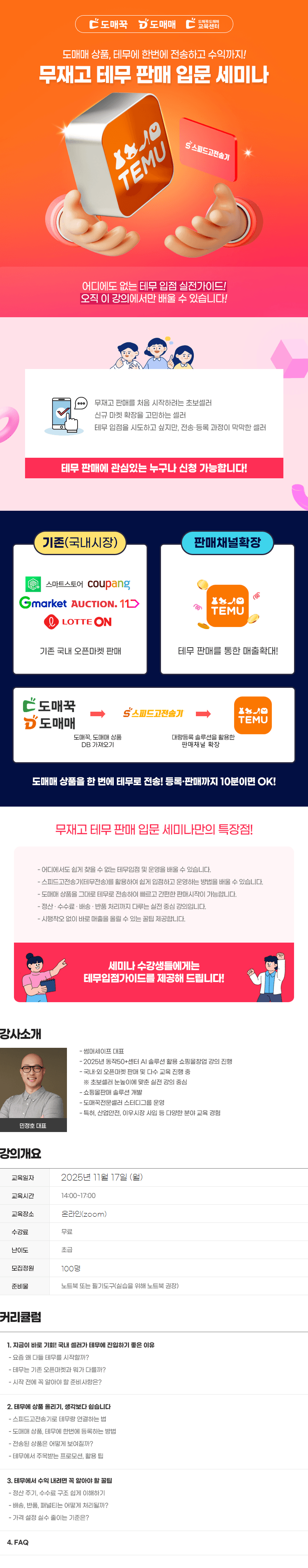* 필독사항 * 본 교육은 온/오프라인 동시에 진행됩니다 강의링크는 교육전일,당일에 발송되며 녹화강의는 제공되지 않으니 정시 참여 부탁드립니다. Zoom(줌) 강의 접속링크 : 교육전일/당일 발송 예정 회의 ID : 교육전일/당일 발송 예정 암호 : 교육전일/당일 발송 예정 테무 입점 관련 문의는, 반드시 아래의 공식 입점 링크를 통해 가입하신 업체만 확인 가능합니다. 위 링크를 통해 입점하지 않은 업체의 경우, 강사님을 통해 전달된 문의 내용도 확인이 불가하니 이 점 유의해 주시기 바랍니다. 테무 입점 링크 :